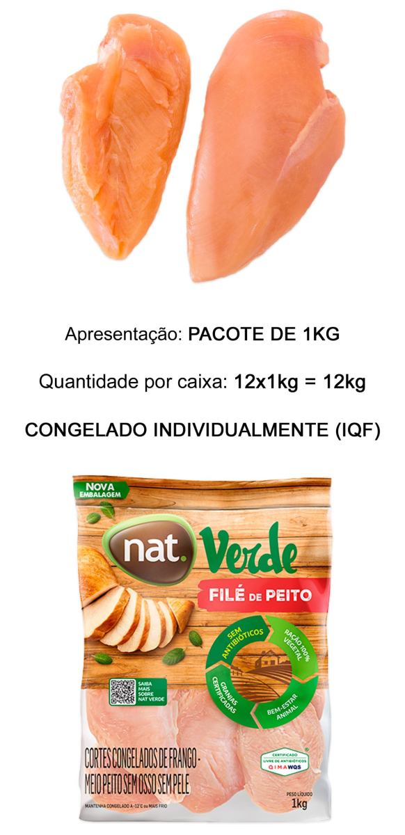MEIO PEITO SEM OSSO, SEM PELE, SEM FILEZINHO, COM GORDURA NATURAL DO PEITO ADERIDA E CONGELADO INDIVIDUALMENTE. CORTE